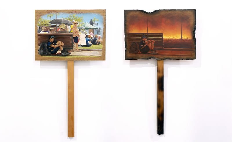 For Tomorrow (2024) For Tommorrow (2024) acrylic paint on masonite panels, pine Inspired by attending climate protests and Australia’s climate disasters of the last few years – this diptych confronts the dire consequences of climate inaction for our younger generations. The painted images take direct reference to a photograph taken at a climate protest in […]